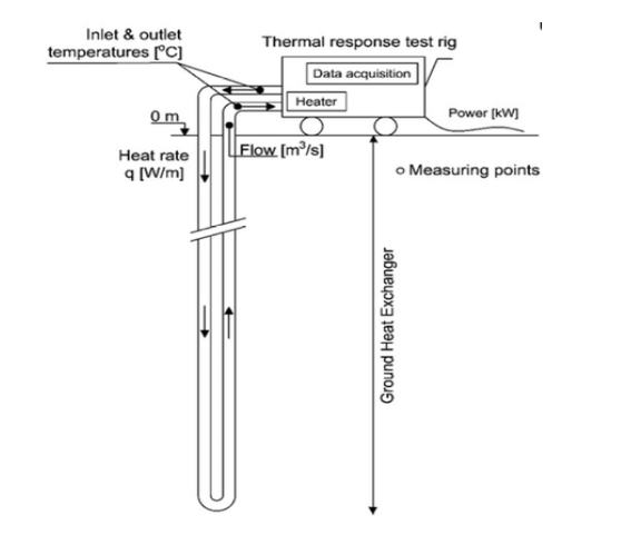 First of all , the undisturbed soil temperature is determined, by recording the temperature at the surface of the borehole or by evaluating the temperature of the liquid circulating in the geoexchanger before activating the cooling or heating. The term thermal response is defined as the measured change in the average temperature of the inlet and outlet temperatures of the fluid over time. Superimposed temperature variations are usually dependent on changing ambient air temperature or corresponding variations in power supply to the electric heater and circulation pump. Therefore air temperature and power consumption are often measured to separate such disturbances during evaluation. It is worth noting that several equipment compensate for these fluctuations by using a control to provide constant power.